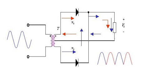 全波整流電路:利用副邊有中心抽頭的變壓器和兩個二極管構(gòu)成如下圖所示的全波整流電路,從圖中可見,正負(fù)半周都有電流流過負(fù)載,提高了整流效率。