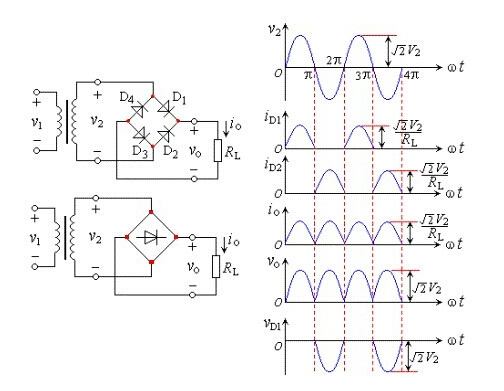 單相橋式整流電路是最基本的將交流轉(zhuǎn)換為直流的電路,在分析整流電路工作原理時,整流電路中的二極管具有單向?qū)щ娦浴.?dāng)正半周時,二極管D1、D3導(dǎo)通,在負(fù)載電阻上得到正弦波的正半周。當(dāng)負(fù)半周時,二極管D2、D4導(dǎo)通,在負(fù)載電阻上得到正弦波的負(fù)半周。在負(fù)載電阻上正、負(fù)半周經(jīng)過合成,得到的是同一個方向的單向脈動電壓。